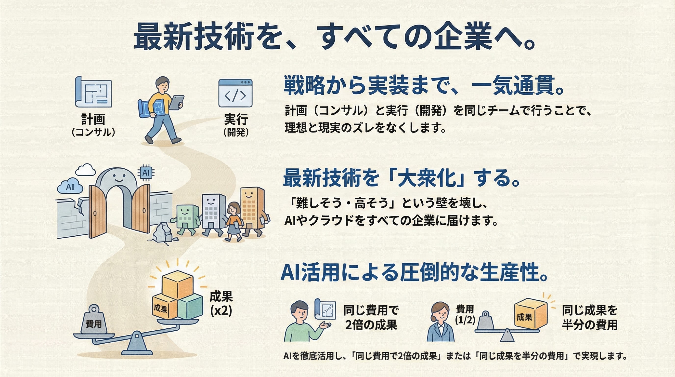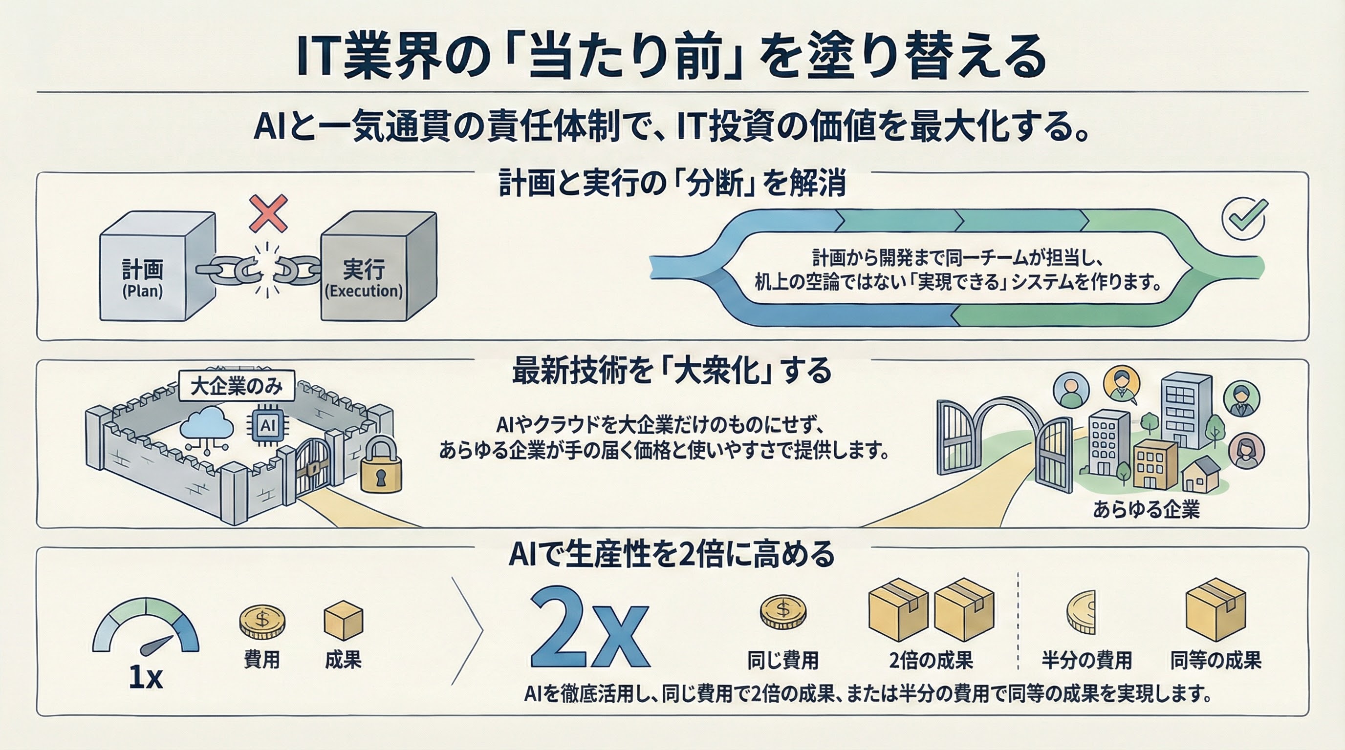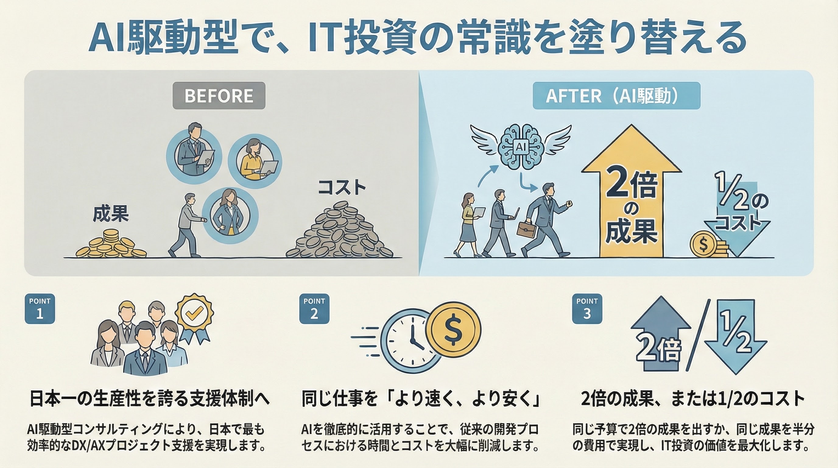 「生産性が高い」とは、どういうことでしょうか。 簡単に言うと、同じ仕事を、もっと速く、もっと安くできるということです。 私たちは、AIを徹底的に活用することで、これを実現します。 同じ費用で、2倍の成果を出す。同じ成果を、半分の費用で実現する。 AIの力を最大限に活かすことで、お客様のIT投資をもっと効果的なものにする。それが、私たちの目指す姿です。